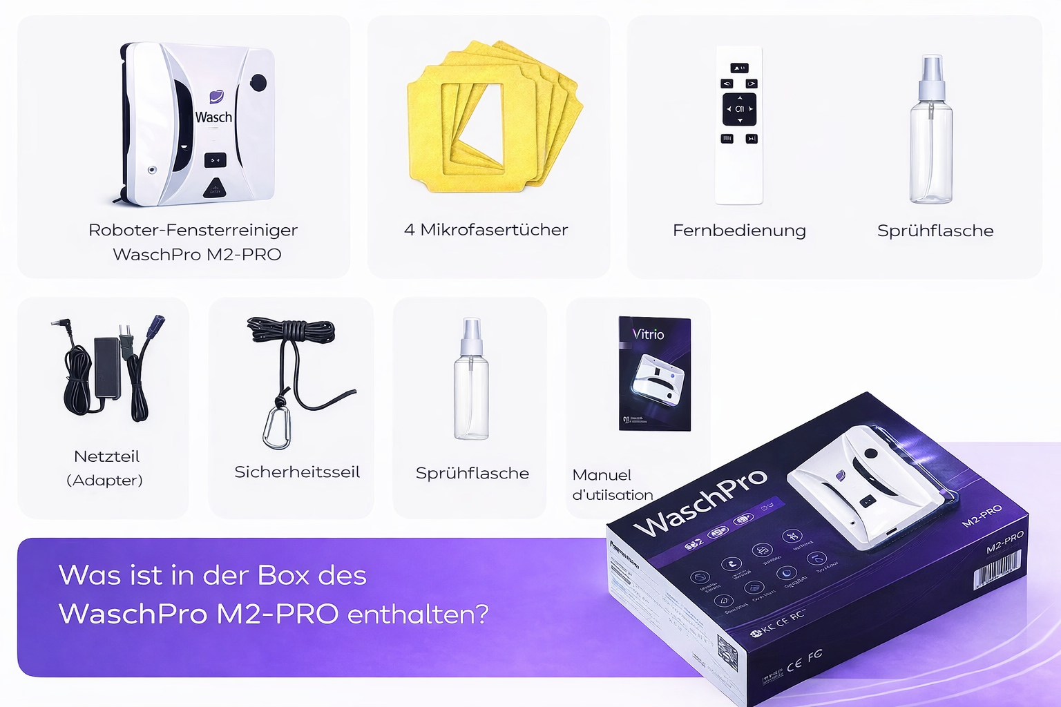 Die Lieferung umfasst den Roboter WaschPro™, sein Stromversorgungskabel, eine Sicherheitskette, eine Fernbedienung, wiederverwendbare Mikrofaserwäsche und eine Gebrauchsanleitung.